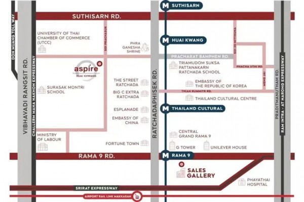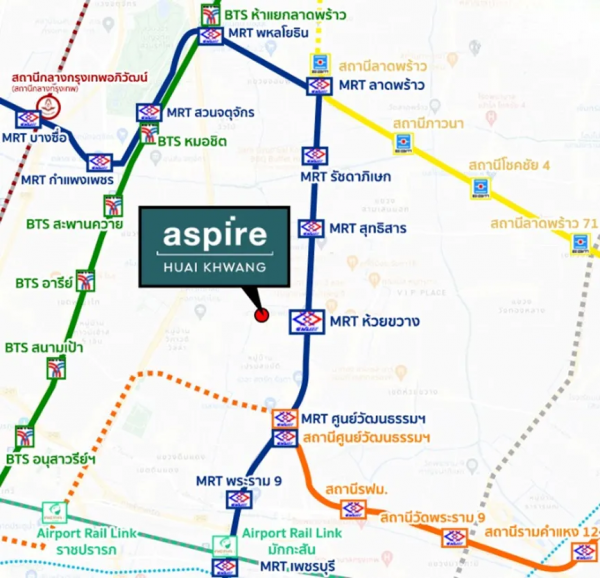 Aspire Huai Khwang 位于 Prachasongkhro 路,紧邻辉煌市场和辉煌地铁站(MRT Huai Khwang),距离仅750米,MRT蓝色线是贯穿曼谷的大动脉,也是唯一的环线地铁,可轻松链接曼谷各个核心区域,不仅跨越曼谷三大CBD中央商务区,而且围绕整个曼谷市中心建设。