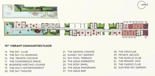 城市森林公园、活力公园、半户外休息室、水帘、活力休闲座椅、活力公园、跑步花园、大堂休息室、创意工作室、专属休息室、天际俱乐部、会议空间与商务会议休息室、多功能娱乐区、天际影院、游戏休息室、天空泳池露台、AQUA酒吧、私人按摩浴缸、私人健身房、日出空中花园等